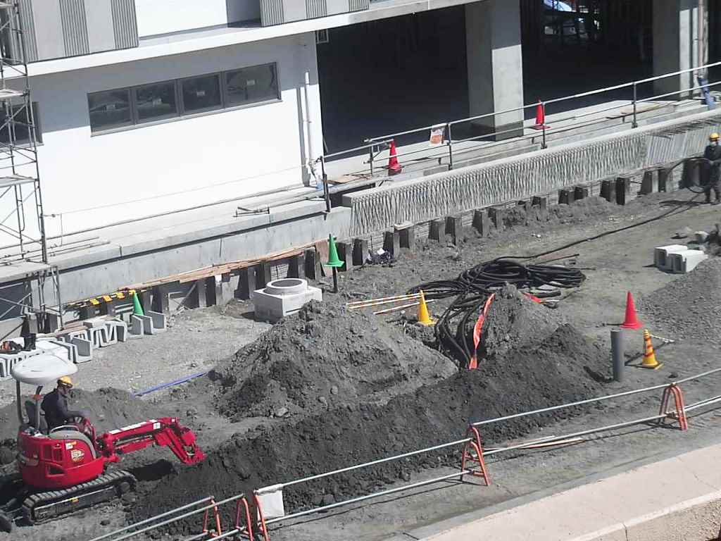 北側同様、南側にも新病棟1階車寄せ(ピロティー)部分に繋がる斜路(スロープ)を建設するため、掘削作業を始めとした事前の準備工事が行われています。